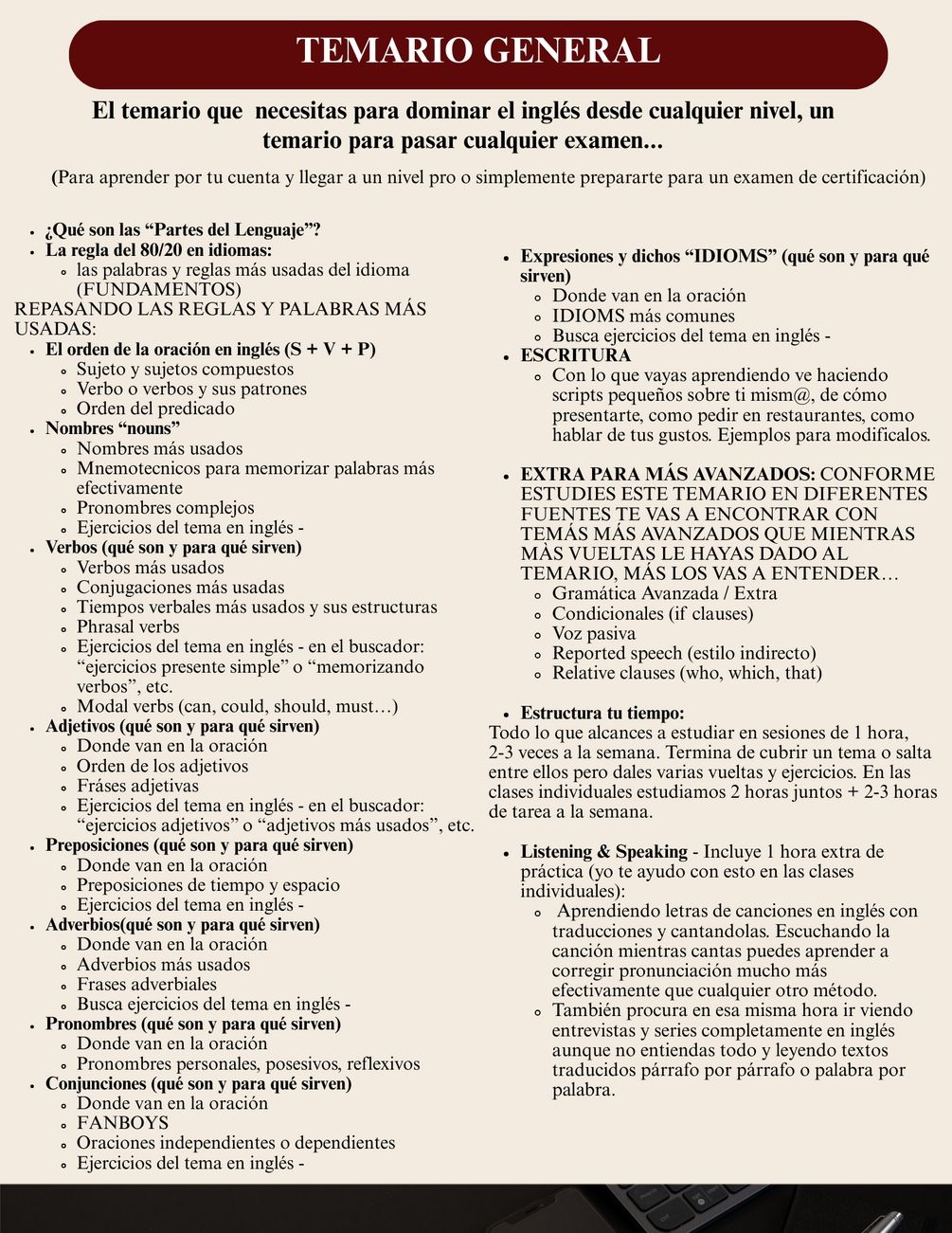 - Las palabras más usadas y las reglas gramaticales clave.